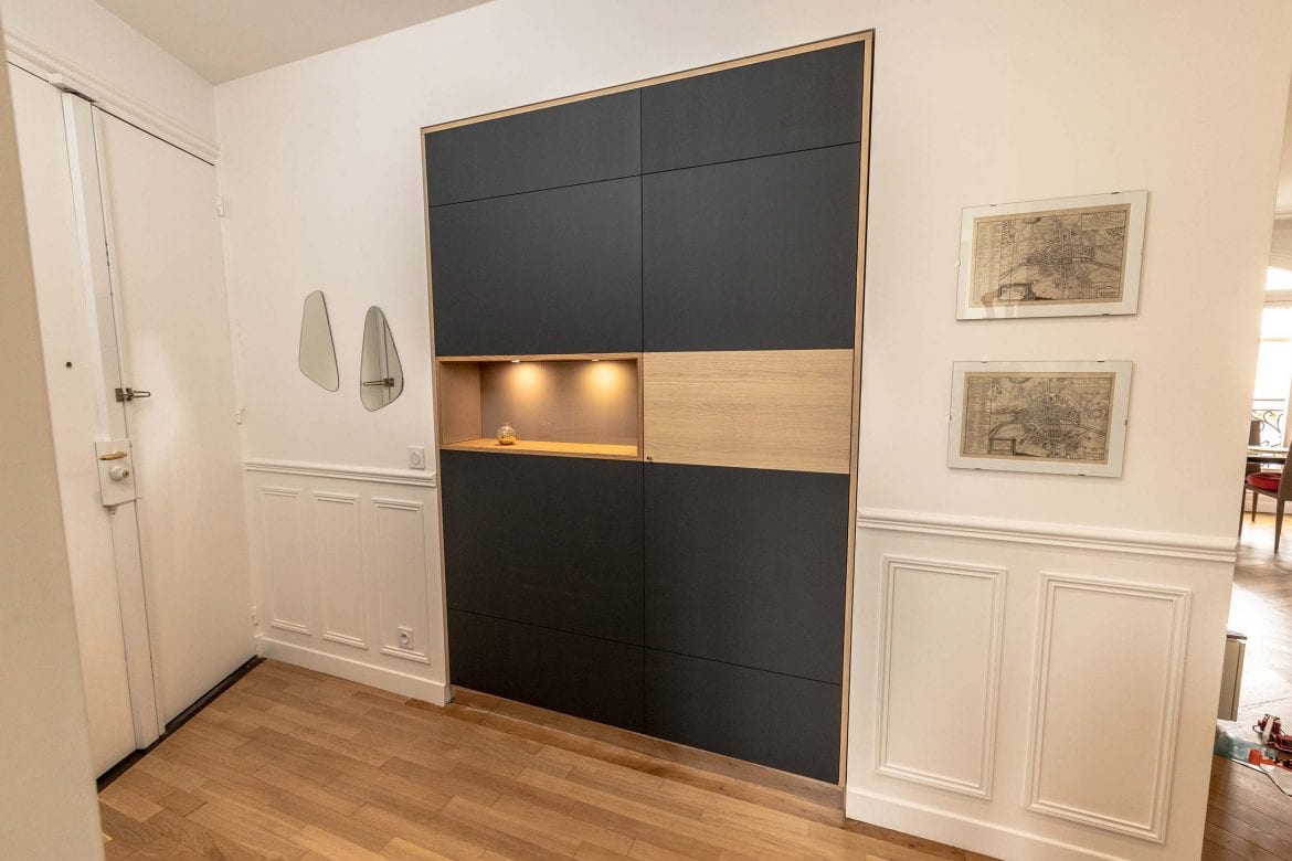 Aménagement du salon et de l’entrée d’un appartement à Levallois-Perret.